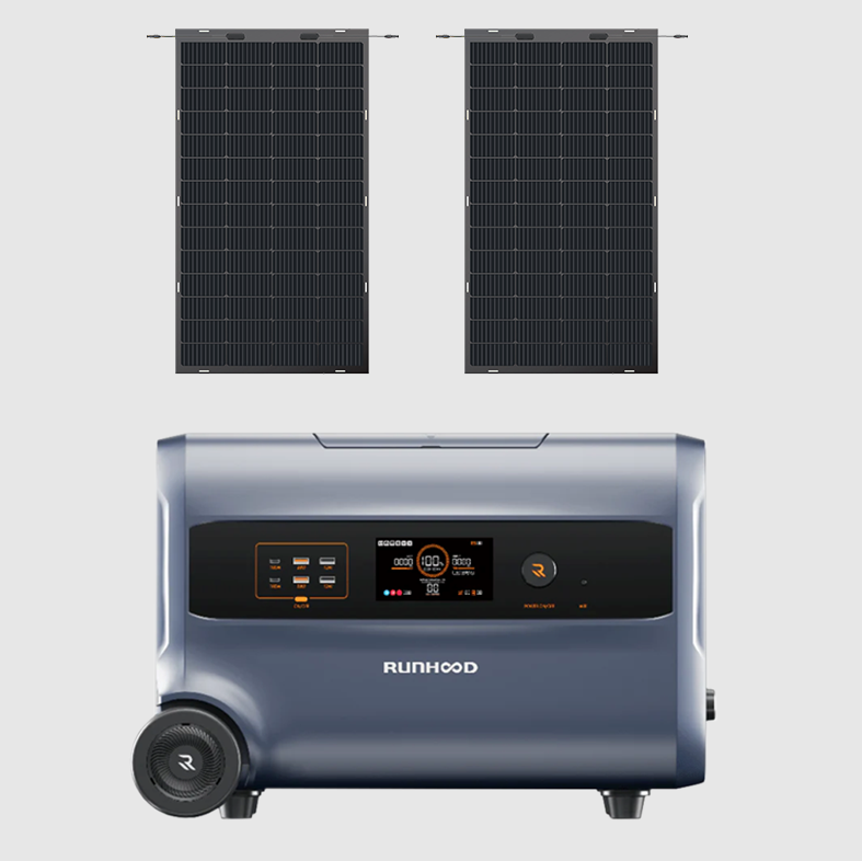 The Runhood F2400 Power Station + 2X Voltofy Flexo Pads combo deal is available for R 49,990.00, offering a 3-in-1 intelligent power and storage system. This portable power station features: